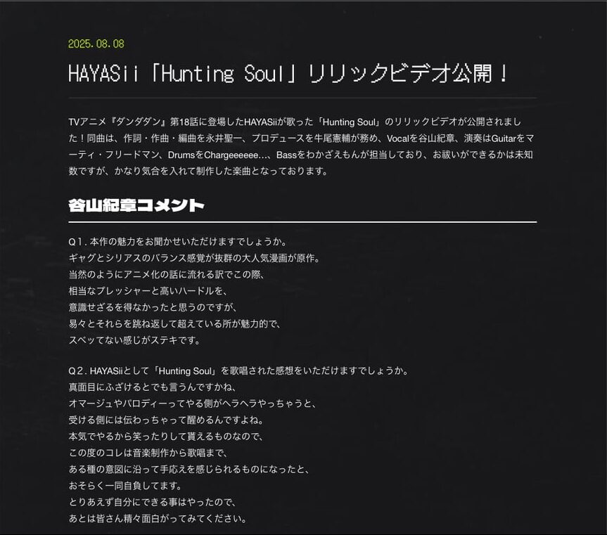 2025年8月7日深夜放送のアニメ『ダンダダン』(第2期第18話)で、ライブ風にお祓いをするバンド「HAYASii(囃子)(はやし)」が披露した劇中楽曲『Hunting Soul』。