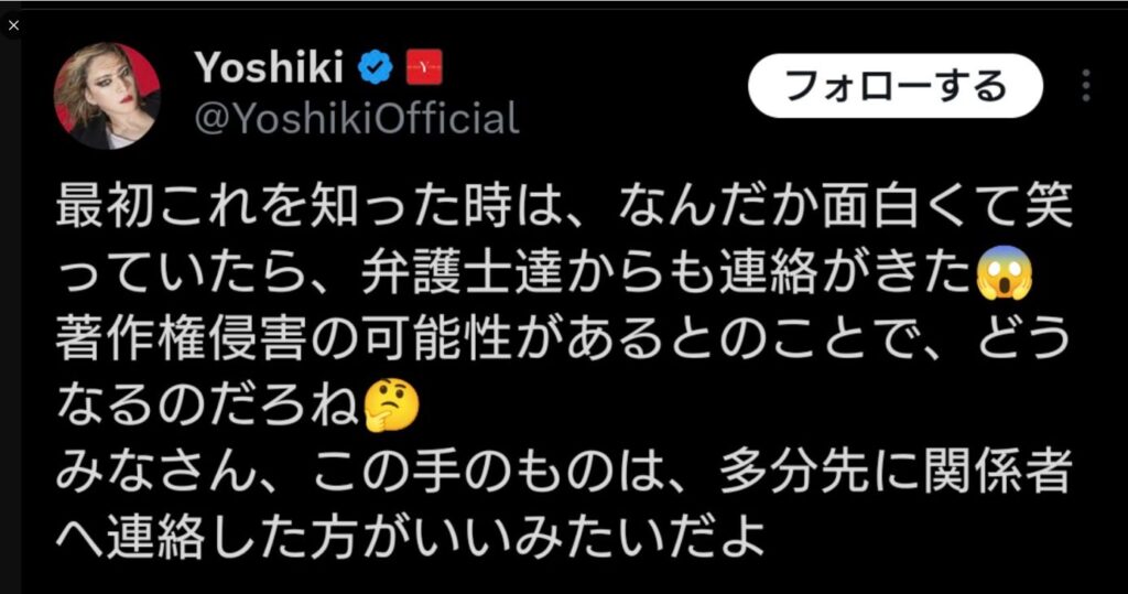 これらの投稿から、YOSHIKIさん自身は当初コメディ的と捉えていたものの、著作権問題が関係者を通じて正式に浮上したことで、状況に深刻さを感じ始めたようです。