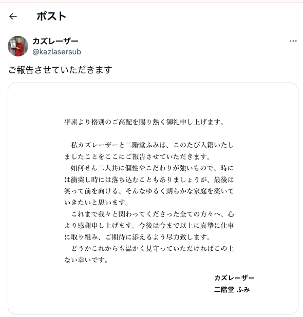 - 結婚の電撃発表:2025年8月10日、二人は自身のSNSと公式サイトにて突然の結婚報告を行い、多くのファンに驚きをもって迎えられました。