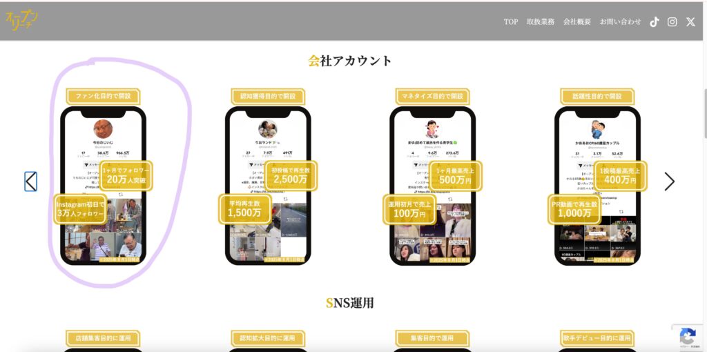 同社は “SNS運用代行会社 & クリエイター事務所” として、バズ発信を得意とする動画事業を展開しているようです。